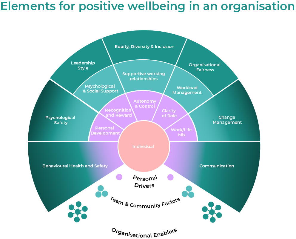 Drawing on the latest global research, we’ve developed a comprehensive framework designed to foster a proactive approach to workplace wellbeing. This framework addresses every aspect of work that can influence wellbeing. Poor management of these areas can pose risks, but when approached thoughtfully, they can help create a healthy workplace culture that actively promotes positivity and resilience.